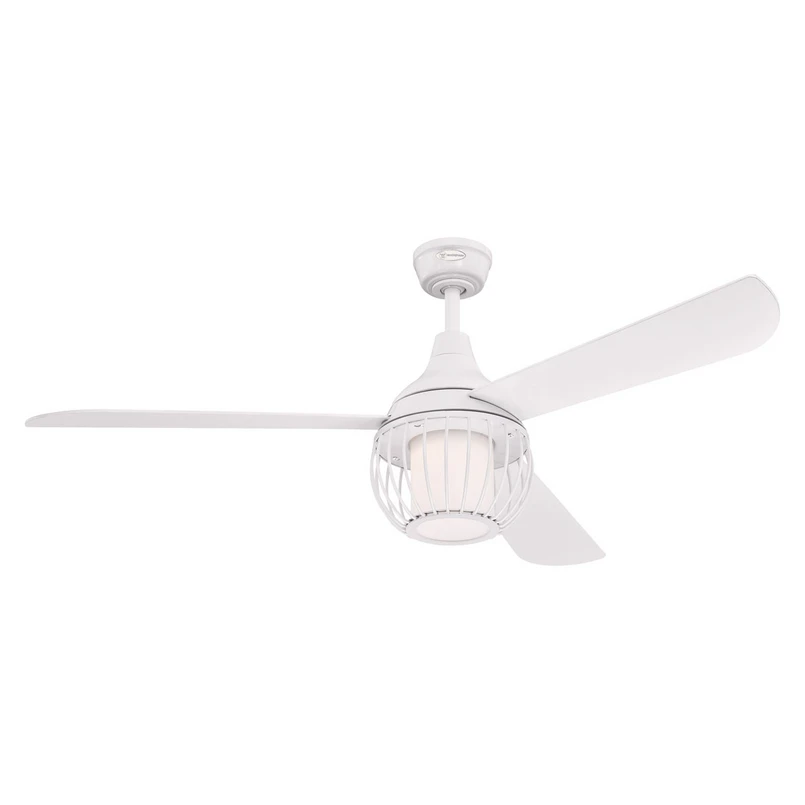 Graham ceiling fan with cage shade and dimmable LED light The Graham ceiling fan is a white ceiling fan with three swivelling rotor blades. The modern, cage-shaped lampshade wraps protectively around the frosted opal glass diffuser. The LED provides a warm white, dimmed light. Function: The fan is started and stopped using the enclosed remote control. 3 speeds and 3 wattages can be set and it is possible to switch between the summer and winter function. The light can also be switched on and off and dimmed using the remote control. Technical data: Power per speed: - 54 watts at 204 rpm - 29 watts at 146 rpm - 16 watts at 101 rpm - Air flow: maximum 134.5 m³/min
