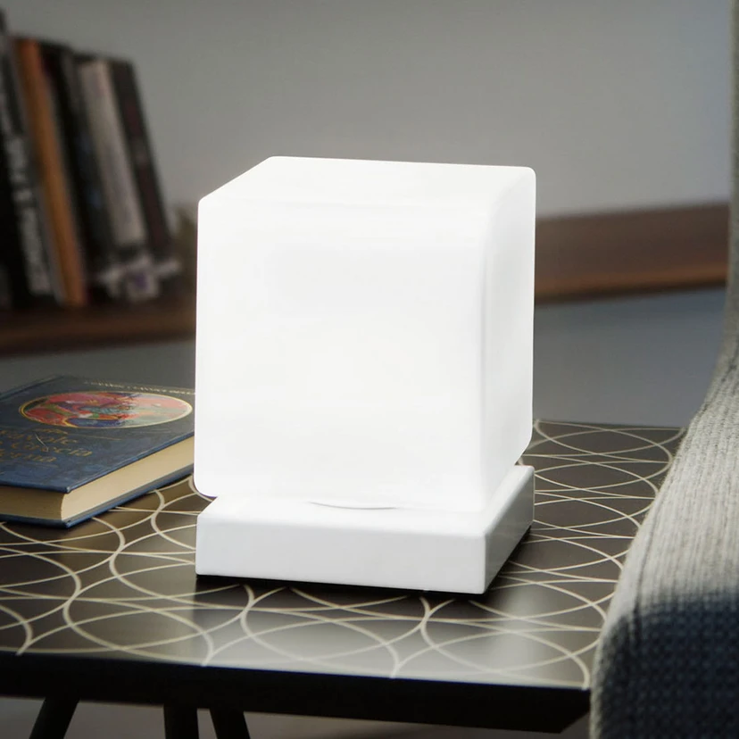 Cubic Brenta LED table lamp with geometric charm and touch dimmer The linear design of the Brenta LED table lamp characterises this modern light, as does the 3-stage touch dimmer. This makes it child's play to achieve the desired lighting effect. The homogeneously illuminated glass cube of the Brenta table lamp provides the geometric charm, while the light can be operated very economically thanks to modern LED technology. The blown glass in white also harmonises perfectly with the cool metal frame of the light. Timeless classic understatement has perfected the Brenta lamp to perfection. Whether as a bedside table lamp or on a side table, this no-frills LED bulb is perfect in almost any room and blends in perfectly with the existing interior design.